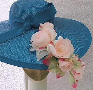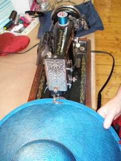 Here I am making an electric blue hat for the shop and the resulting trim - my designs more than often evolve and I had little idea at the start that this hat would have the pink flowers dripping off the front as illustrated by the last photo. I rather like the effect and think this hat has maximum impact and wow factor without being too over the top. What do you think ?